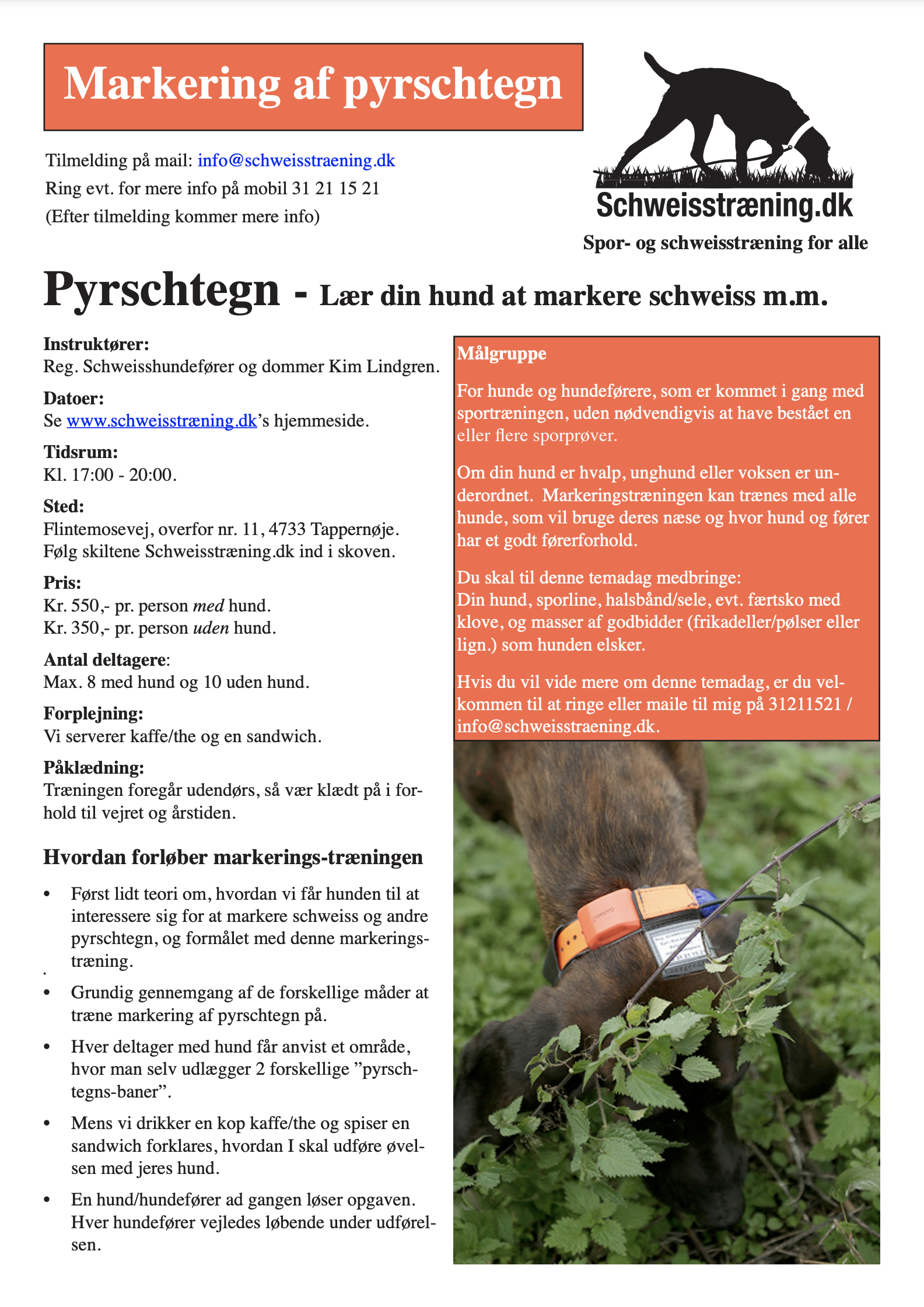 Hvis du vil lære din hund at markere pyrschtegn som hår, schweiss, knoglestumper m.m. på et anskudssted, sårleje eller under selve sporudredningen, er det på denne temadag du du har muligheden for at blive klædt på til at træne denne øvelse som en moduløvelse.
