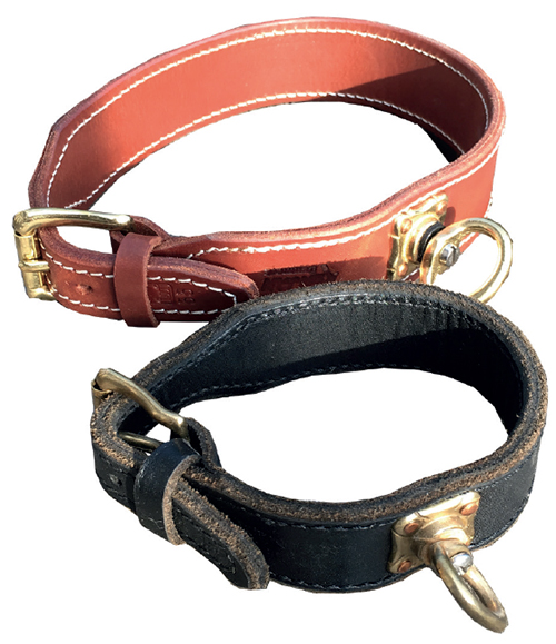 Det brede schweisshalsbånd i dobbeltsyet læder, med drejelig svirvel, er ikke helt billigt, men det holder også i mange år.